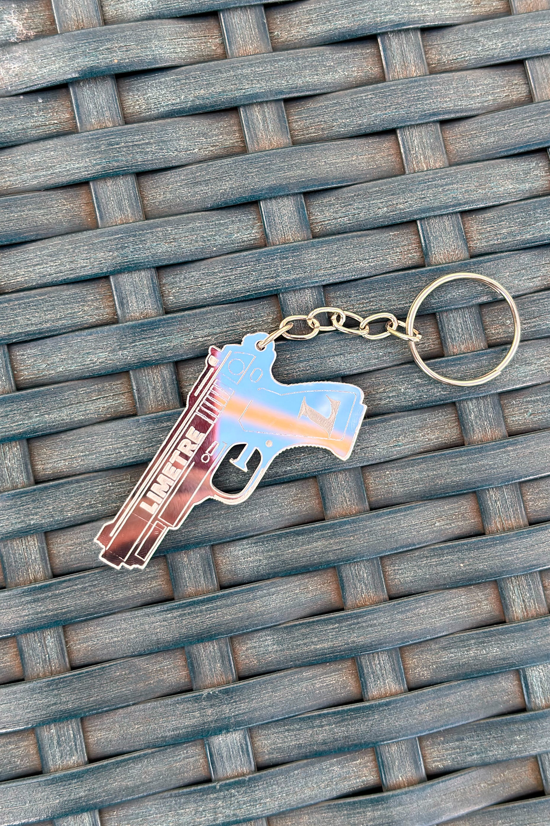 Chaveiro exclusivo da Limetre de Pistola espelhado no prata.